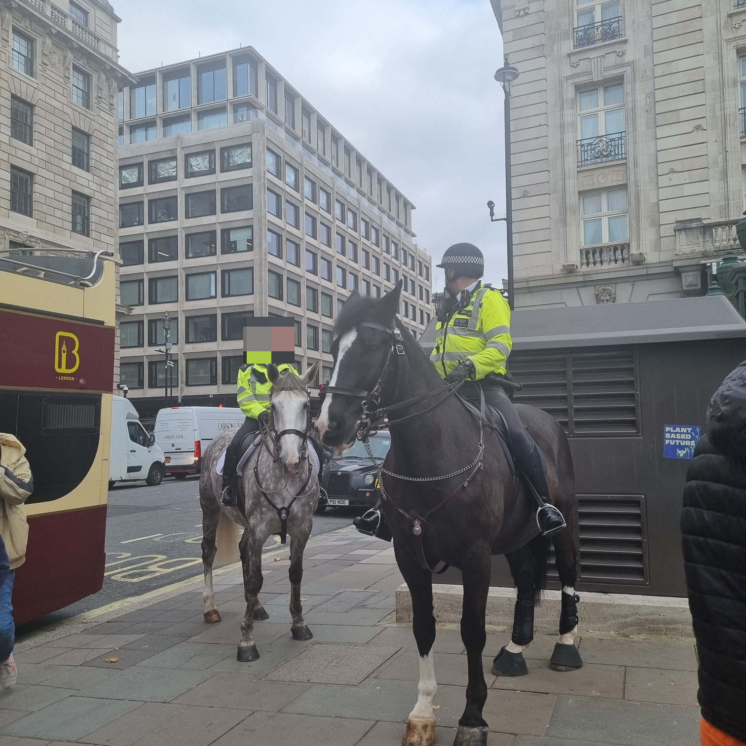 버스에서 내리자 마자 도로에 커다란 말과 교통을 통제하는 경찰?분께서