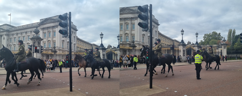 벌어지는 동안 버킹엄 궁전 앞에서 차량을 통제하면서 퍼레이드가 시작이 됩니다.