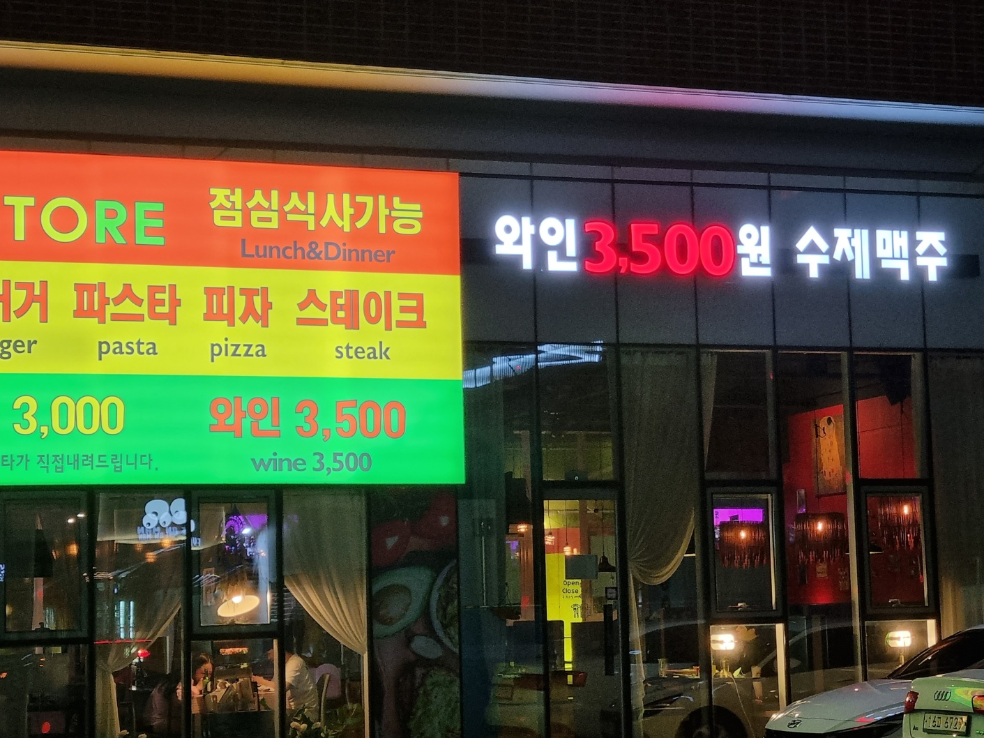 밤 늦은 시간에 가니 분위기가 너무 좋았어요. 벽에 빨간색과 파란색으로 페인트칠한 사장님의 센스를 보면서